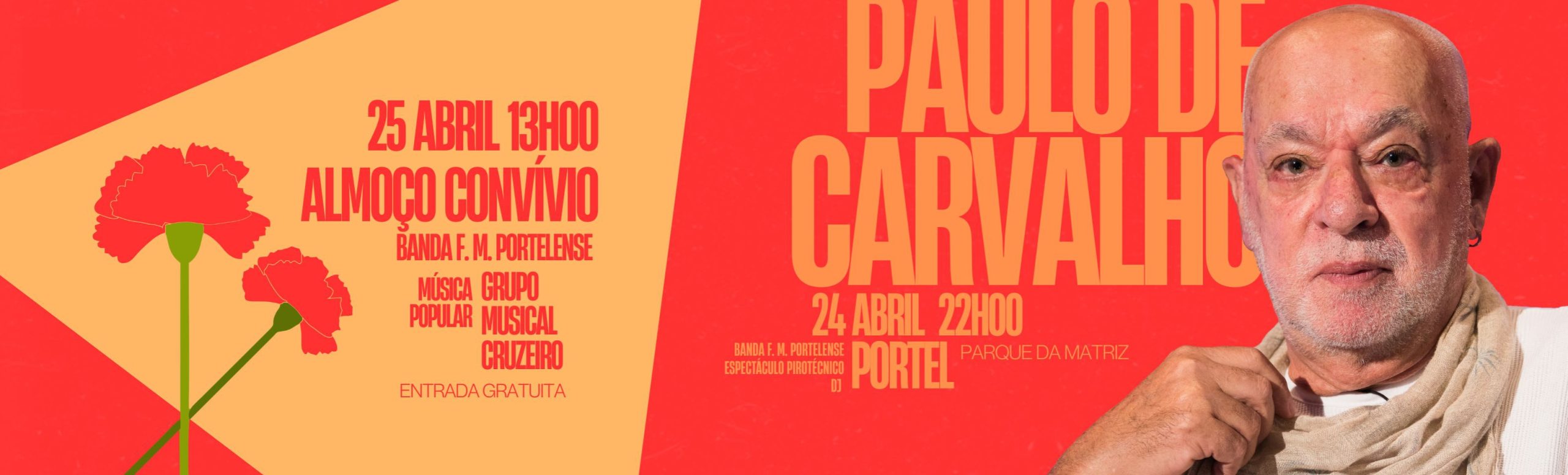 No dia 25 de abril, o Parque da Matriz acolherá o tradicional almoço convívio, pelas 13h00, seguido de espetáculos com a Banda Filarmónica Municipal Portelense e o Grupo Musical Cruzeiro.