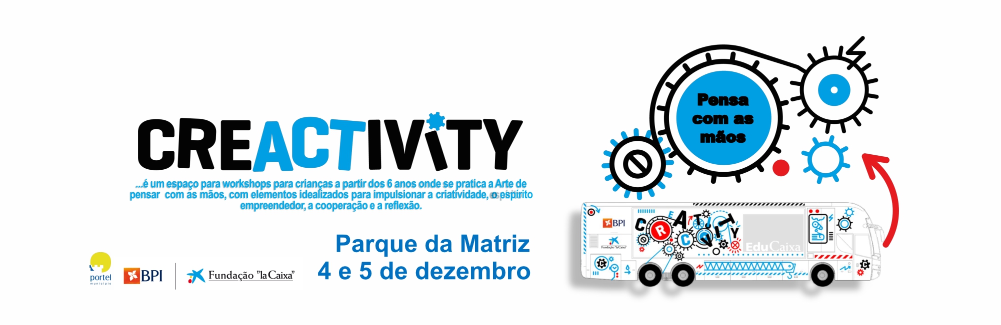 O inovador projeto itinerante “Creactivity” vai estar em Portel nos próximos dias 4 e 5 de dezembro, no Parque da Matriz, trazendo consigo um espaço dedicado à imaginação, criatividade e capacidade de resolução de problemas das crianças. É um Projeto promovido pela Fundação “LaCaixa” – BPI, com a colaboração do Município de Portel.